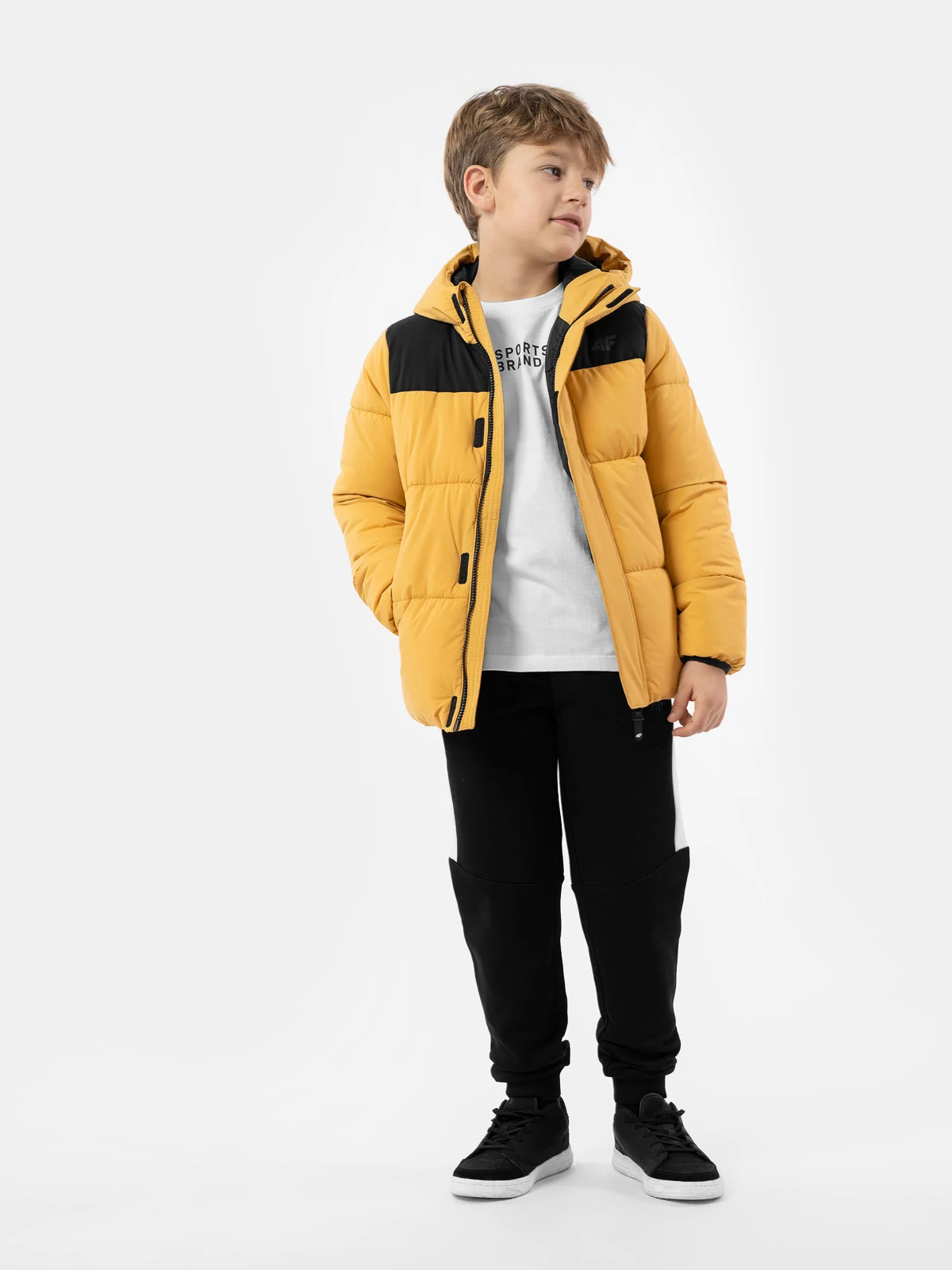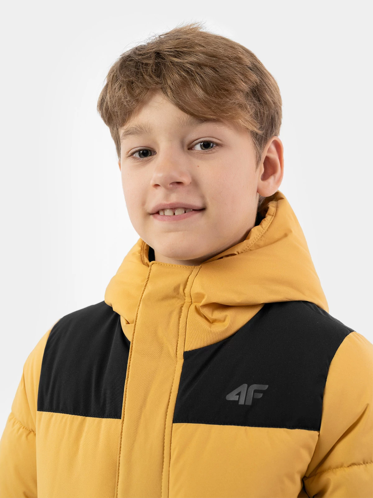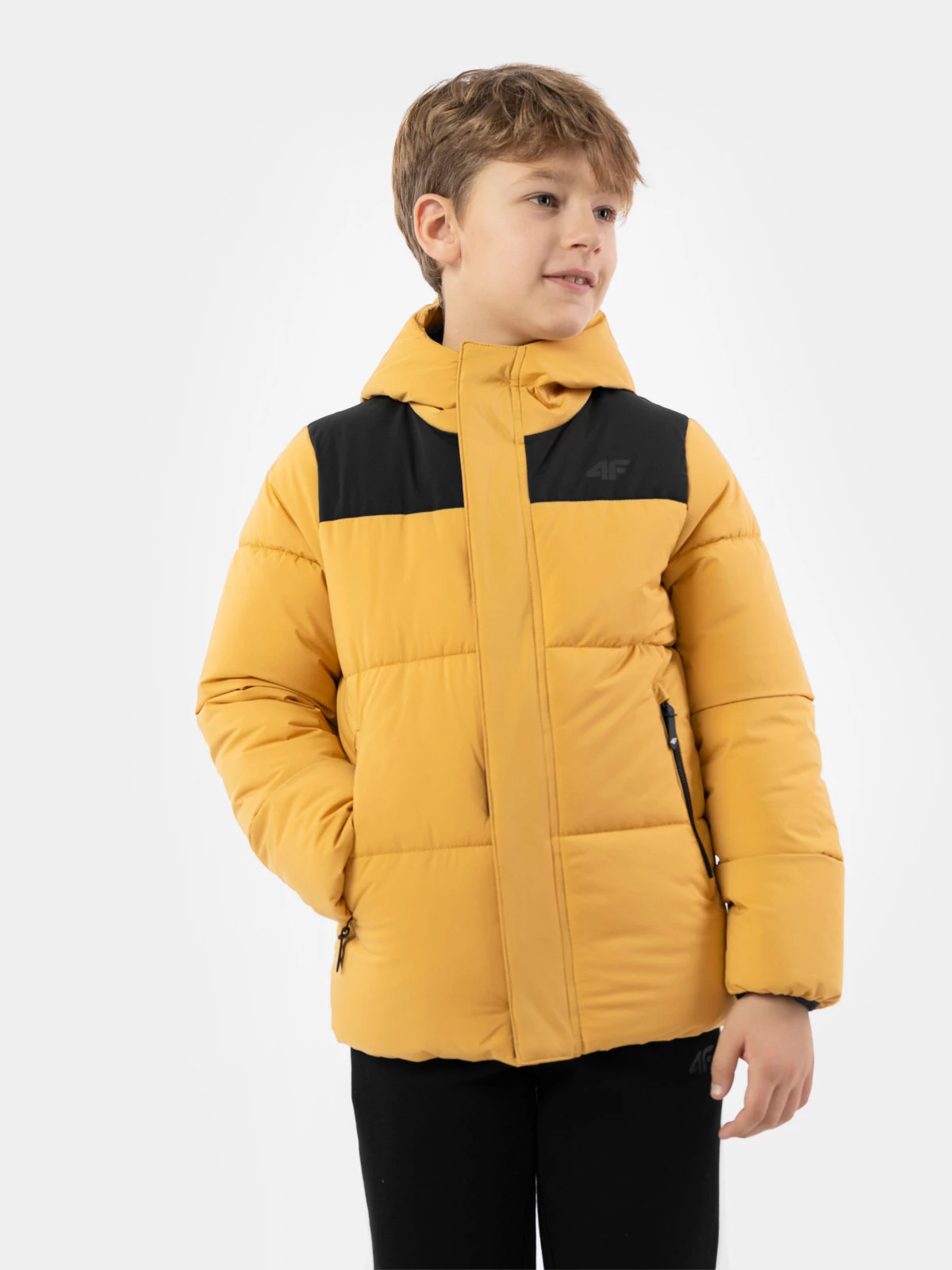 Jachetă matlasată din puf pentru băieți. Este cusută din material moale cu umplutură sintetică ușoară. Este dotată cu glugă integrată și două buzunare călduroase în față în care vor încăpea accesoriile necesare ale copilului.