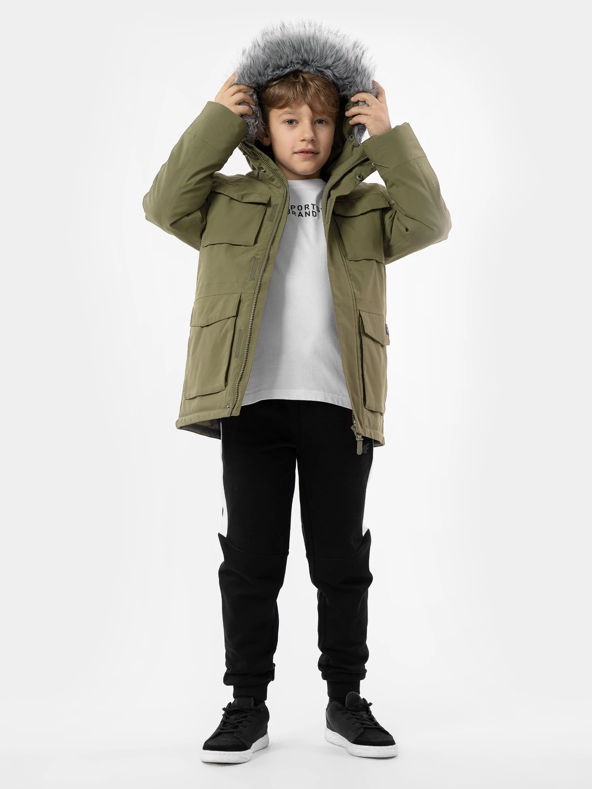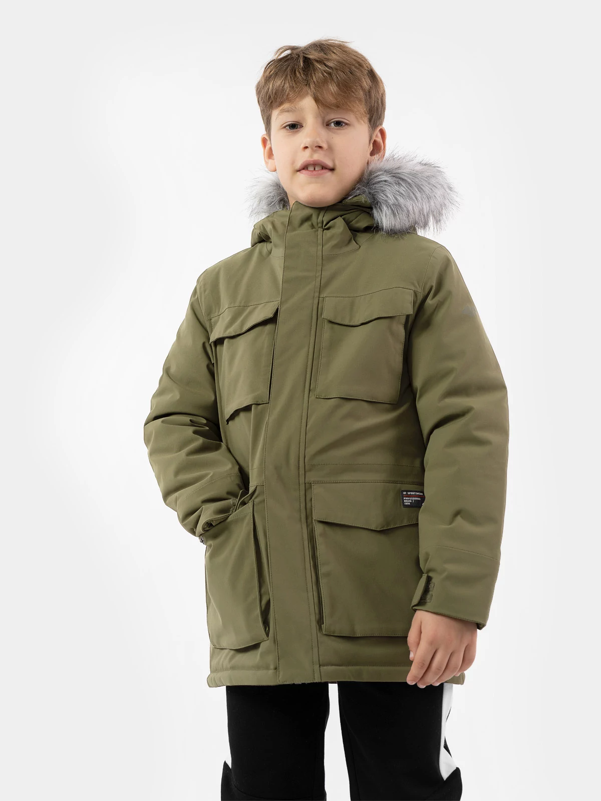 Jacheta este dotată cu buzunare practice în care vor încăpea accesoriile copilului. Gluga reglabilă și confortabilă cu blană artificială detașabilă va proteja copilul împotriva vântului și a frigului.