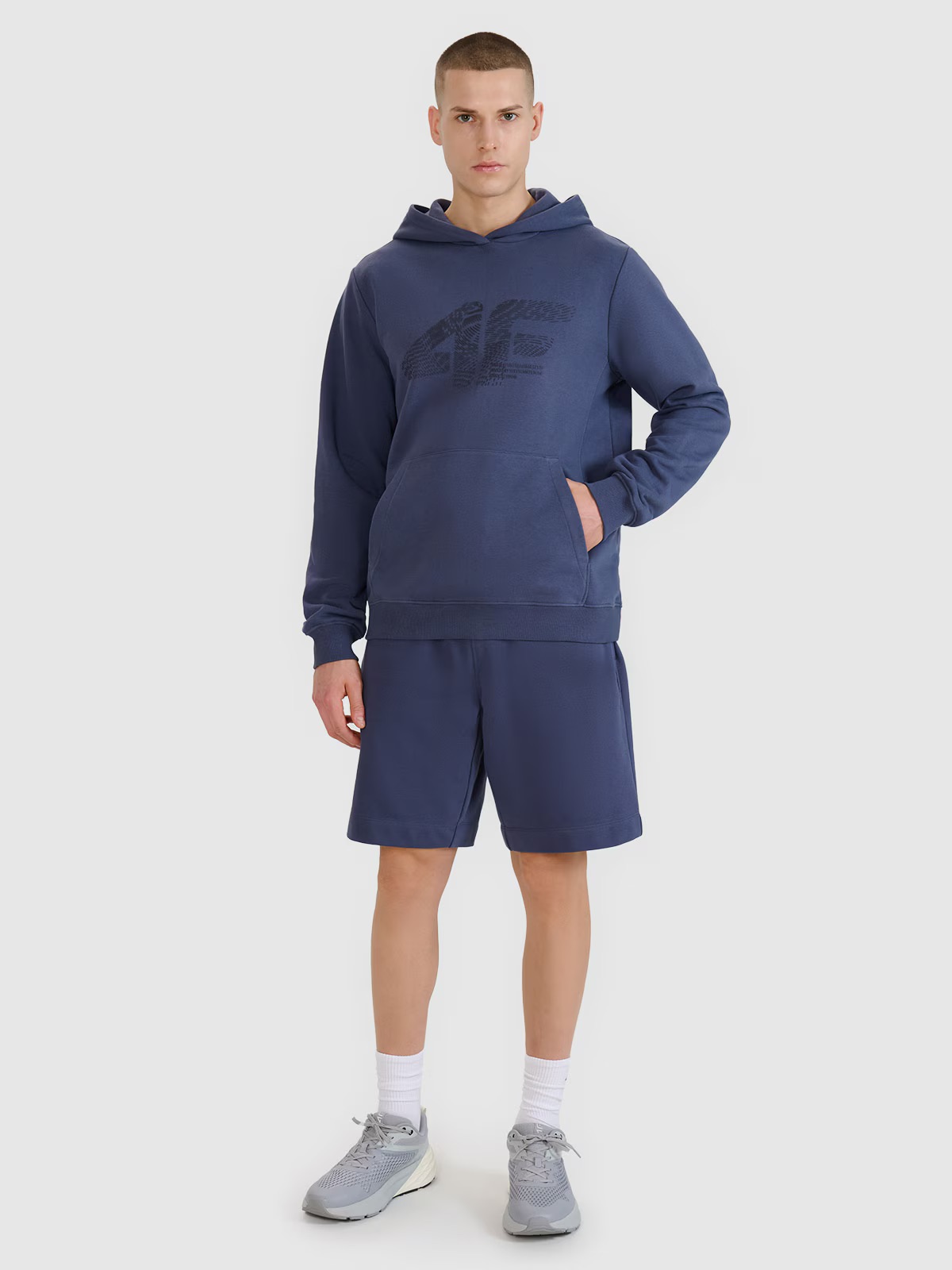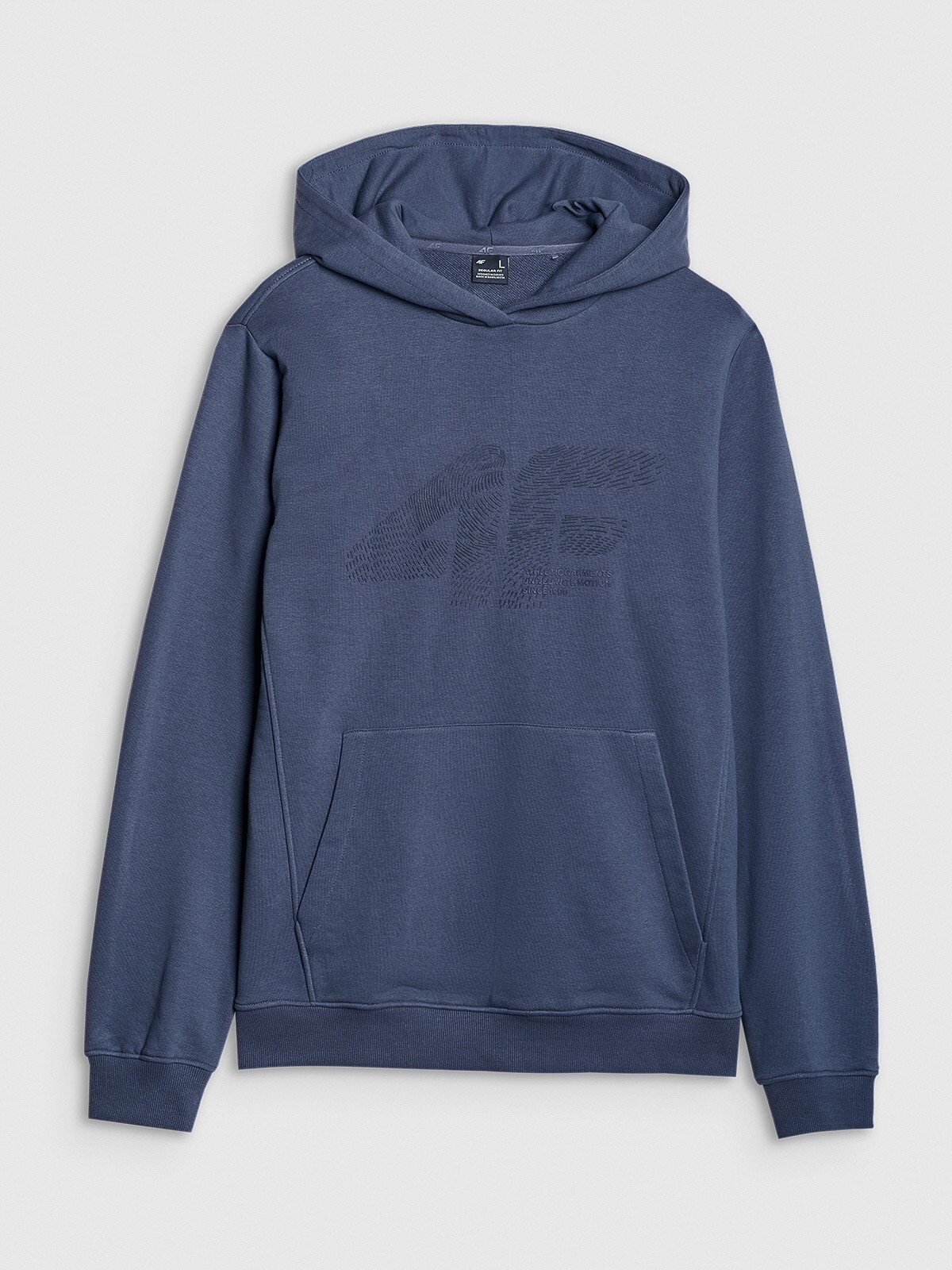 Glugă integrată la decolteu. Manșete elastice cu nervuri. Imprimeu vizibil „4F” pe față și inscripția „Athletic Garments United with Motion since 1995”. Buzunar tip cangur deschis în față. Model pulover. Partea de jos cu nervuri late.