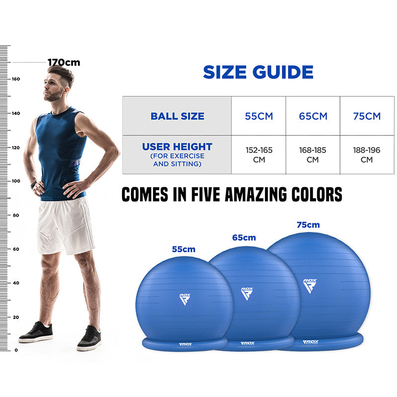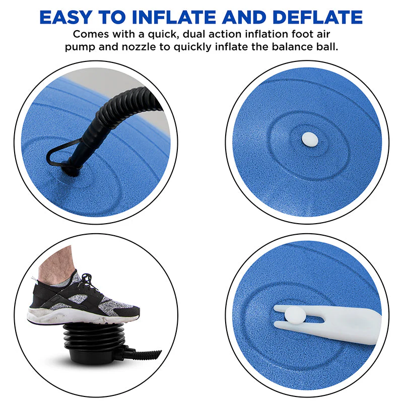 Oferă exercițiilor tale o schimbare la fel de creativă și funcțională, adăugând mingea de fitness cu bază în antrenamentele tale. Îmbunătățește-ți rutinele de calistenic, yoga, cardio și chiar antrenament de forță cu mingea de yoga RDX și Balance Ring Base. Fabricat din PVC anti-explozie, de calitate premium, pentru a susține greutatea (până la 250 kg), păstrând în același timp elasticitatea netedă și se dezumflă lent atunci când este perforat, în loc să explodeze în bucăți. Rezistent la apă și fără toxine pentru a oferi o experiență de antrenament sănătoasă. Inelul de bază pentru minge de yoga oferă un control și stabilitate superbe pentru exercițiile care necesită efort intens sau chiar ipostaze relaxate. Baza inelului gonflabil detașabil (cu o greutate de 800 g) vă permite să efectuați rutine doar cu minge - inclusiv exerciții de aerobic, yoga și fiziologic. Suprafața moale, anti-alunecare, cu model de linii rezistente la alunecare la 360° oferă o aderență superioară pentru a preveni alunecarea și alunecarea nedorită a mingii de gimnastică. Minge de fitness ideală pentru sala de sport de acasă pentru a realiza exerciții pentru întregul corp, pentru a îmbunătăți echilibrul și pentru a calma durerea. Recomandat pentru utilizare în timpul sarcinii, oferind o suprafață confortabilă de ședere pentru corectarea posturii și ameliorarea presiunii de pe coloana vertebrală. Excelent pentru exerciții de naștere pentru pregătirea nașterii. Setul de minge de stabilitate și de bază ușor de umflat include o pompă de picior cu umflare rapidă, 2 opritoare de aer, 1 dispozitiv de îndepărtare a opritoarelor, manual de exerciții cuprinzător și set de tuburi de rezistență pentru o parte superioară imediată a corpului și antrenamente de întărire a nucleului. Disponibil în 5 culori diferite, inclusiv roșu, albastru, gri, roz și violet. Alegeți dintre 3 dimensiuni – 55 cm (900 g), 65 cm (1100 g), 75 cm (1300 g) pentru setul perfect de minge și bază de yoga în funcție de înălțimea dvs.
