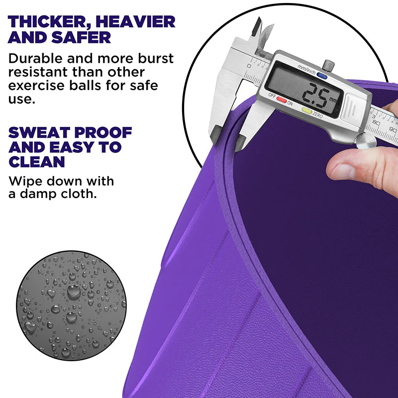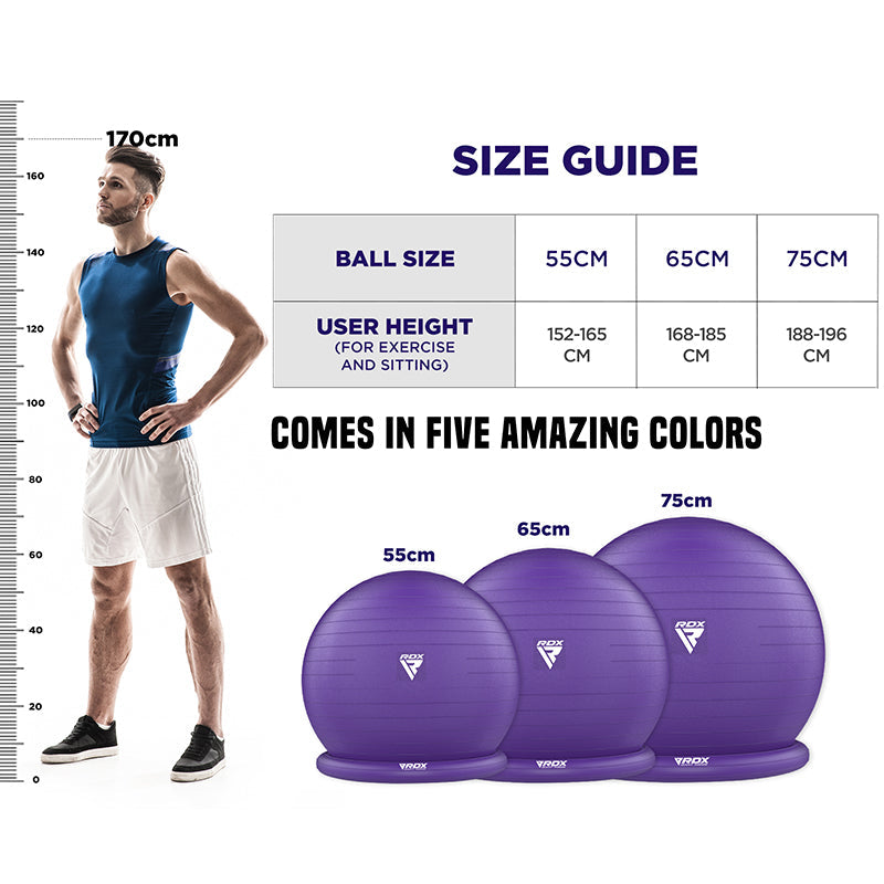 Oferă exercițiilor tale o schimbare la fel de creativă și funcțională, adăugând mingea de fitness cu bază în antrenamentele tale. Îmbunătățește-ți rutinele de calistenic, yoga, cardio și chiar antrenament de forță cu mingea de yoga RDX și Balance Ring Base. Fabricat din PVC anti-explozie, de calitate premium, pentru a susține greutatea (până la 250 kg), păstrând în același timp elasticitatea netedă și se dezumflă lent atunci când este perforat, în loc să explodeze în bucăți. Rezistent la apă și fără toxine pentru a oferi o experiență de antrenament sănătoasă. Inelul de bază pentru minge de yoga oferă un control și stabilitate superbe pentru exercițiile care necesită efort intens sau chiar ipostaze relaxate. Baza inelului gonflabil detașabil (cu o greutate de 800 g) vă permite să efectuați rutine doar cu minge - inclusiv exerciții de aerobic, yoga și fiziologic. Suprafața moale, anti-alunecare, cu model de linii rezistente la alunecare la 360° oferă o aderență superioară pentru a preveni alunecarea și alunecarea nedorită a mingii de gimnastică. Minge de fitness ideală pentru sala de sport de acasă pentru a realiza exerciții pentru întregul corp, pentru a îmbunătăți echilibrul și pentru a calma durerea. Recomandat pentru utilizare în timpul sarcinii, oferind o suprafață confortabilă de ședere pentru corectarea posturii și ameliorarea presiunii de pe coloana vertebrală. Excelent pentru exerciții de naștere pentru pregătirea nașterii. Setul de minge de stabilitate și de bază ușor de umflat include o pompă de picior cu umflare rapidă, 2 opritoare de aer, 1 dispozitiv de îndepărtare a opritoarelor, manual de exerciții cuprinzător și set de tuburi de rezistență pentru o parte superioară imediată a corpului și antrenamente de întărire a nucleului. Disponibil în 5 culori diferite, inclusiv roșu, albastru, gri, roz și violet. Alegeți dintre 3 dimensiuni – 55 cm (900 g), 65 cm (1100 g), 75 cm (1300 g) pentru setul perfect de minge și bază de yoga în funcție de înălțimea dvs.