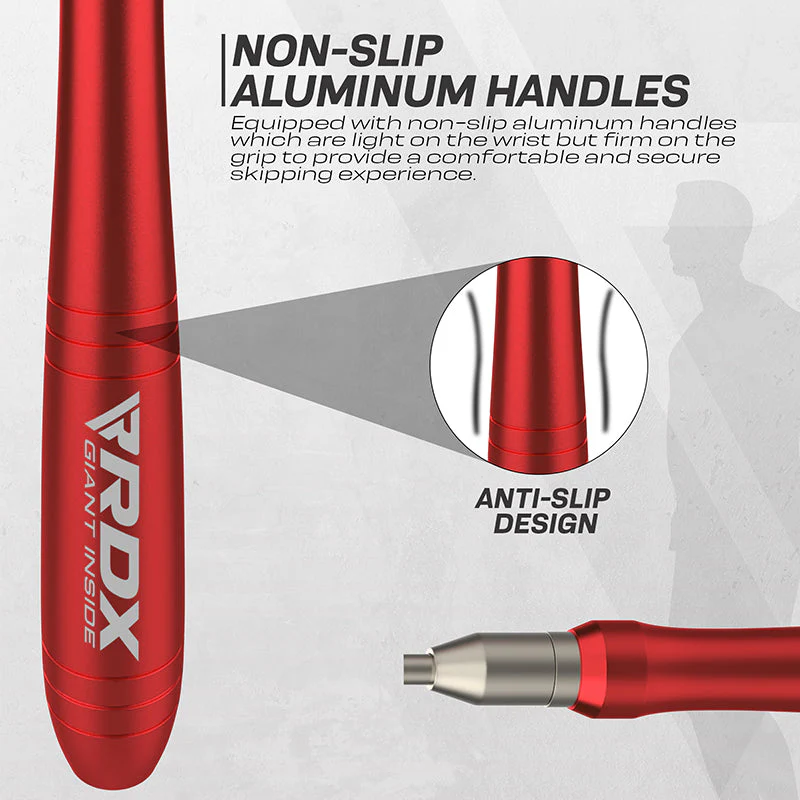 Lucrul pentru atingerea obiectivelor tale de mobilitate, anduranță și antrenament de forță nu ar putea deveni mai ușor cu coarda de sărit de viteză versatilă din aliaj de aluminiu RDX. Cu designul său elegant și senzația profesională, această frânghie de săritură pentru exerciții ar putea fi cu ușurință noua frânghie de sală preferată și coarda de săritură de viteză de la sala ta de acasă. Excelent pentru o varietate de exerciții, de la rutine de bază pentru săritul cu coarda până la antrenamente XFit sau box pentru a îmbunătăți viteza și coordonarea picioarelor. Designul ușor, anti-alunecare al mânerului din aluminiu permite o prindere mai fermă, fără a fi voluminos în mână. Acest lucru facilitează rutinele mai lungi fără ca mâinile să obosească sau să se încordeze încheieturile, ceea ce face ca frânghiile noastre reglabile să fie ideale pentru toate nivelurile. Cablul de oțel rezistent cu acoperire PVC este mai rezistent – construit pentru a rezista utilizării riguroase și previne deteriorarea cablului de oțel intern din cauza coliziunii cu o suprafață abrazivă. Cablul premium previne, de asemenea, încurcarea și îndoirea, astfel încât să puteți crește viteza și tempo-ul. Un sistem de pivotare cu rulmenți cu bile de înaltă calitate permite o rotație lină, fără frecare, pentru o sărire rapidă fără a întrerupe impulsul. Tehnologia de autoblocare blochează instantaneu cablul în poziție, ceea ce facilitează reglarea rapidă a lungimii cablului pentru diferite înălțimi. Eliminarea necesității de a tăia frânghia. Disponibil în variante de culoare roșu, albastru și negru, cu o husă antimicrobiană cu finisaj metalic pentru portabilitate și, în plus, un manual de exerciții pentru a începe cardio-ul imediat.