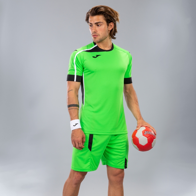 Set format din tricou si pantaloni scurti. Tricou guler rotund, care se evidentiaza prin o culoare contranstanta pe umeri.