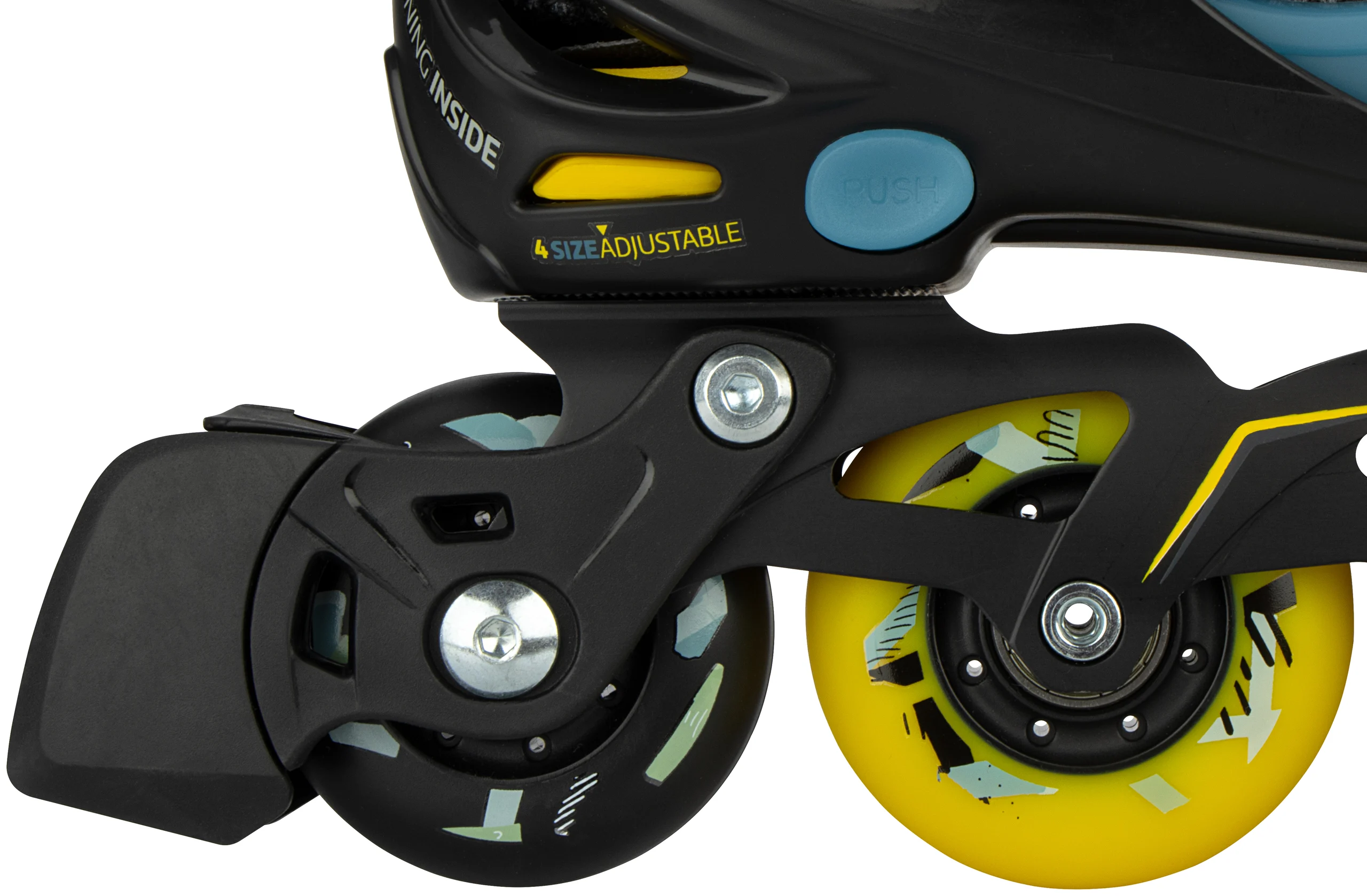 | Caracteristici | • Dimensiune reglabilă la 4 mărimi prin intermediul mecanismului cu buton • Închidere rapidă cu powerstrap din piele PU și șireturi • Carcasă exterioară: PE de înaltă densitate cu absorbție a șocurilor • Pantof interior: poliester confortabil, EVA și spumă perlă • Șasiu: aluminiu extrudat • Roți: finisaj PU turnat 85,4 mm x 26 mm mat: 83,4, 26 mm si dimensiunea 37-40: 72 x 24 mm • Rulmenti: sigilati ABEC 7 cromati • Frana: TPR 85A • Scule: 2 chei hexagonale incluse |