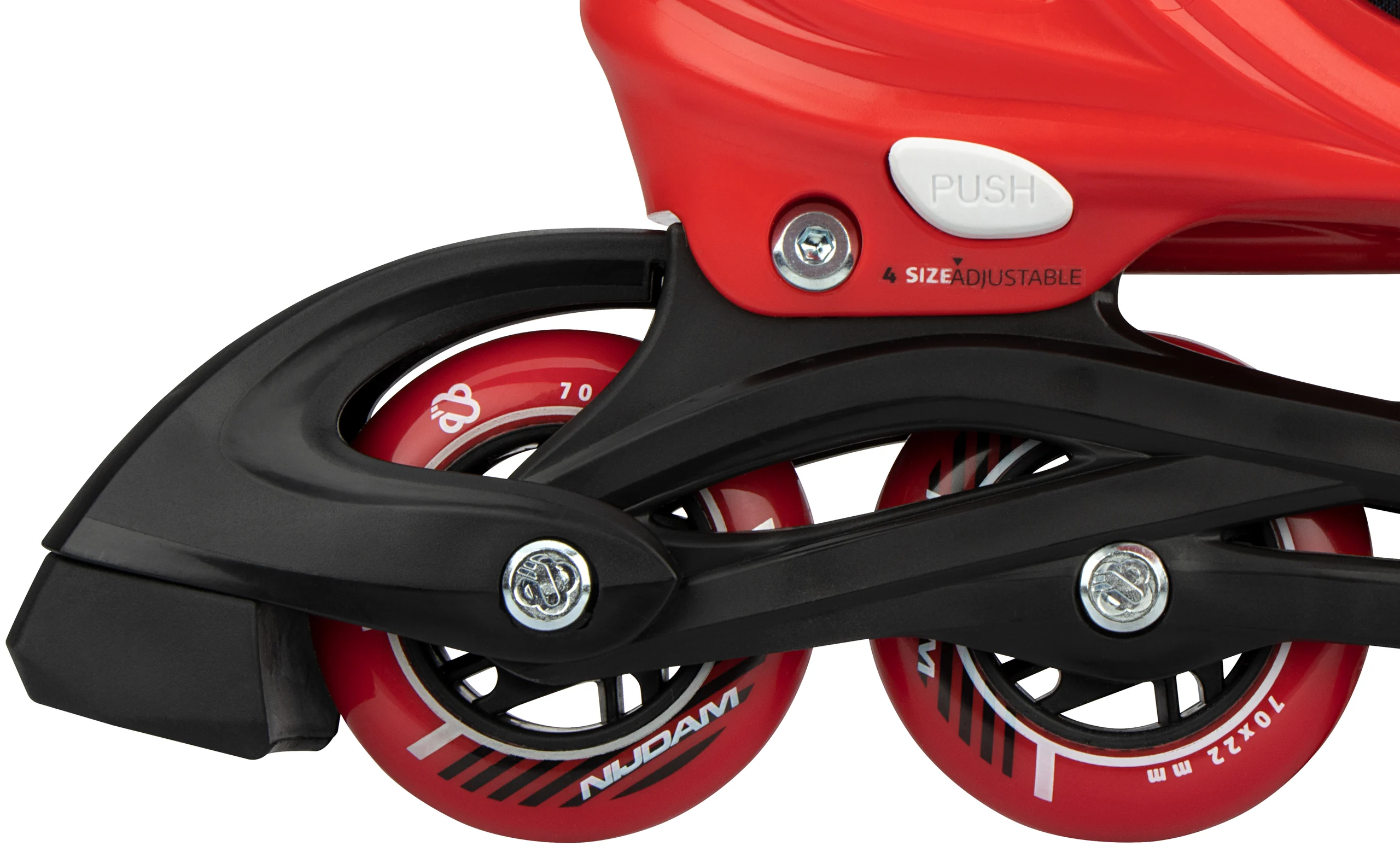 | Caracteristici | • Dimensiune reglabilă la 4 mărimi prin intermediul mecanismului cu buton • Închidere rapidă • Carcasă exterioară: PE de înaltă densitate cu absorbție a șocurilor • Pantof interior: poliester confortabil, EVA și spumă perlă • Șasiu: PP rezistent la impact • Roți: PU turnat 82A, 70 x 24 mm • Rulment: carbon TPR 82A, 70 x 24 mm • Rulment: ABEC55. • Instrumente: 2 chei hexagonale incluse |