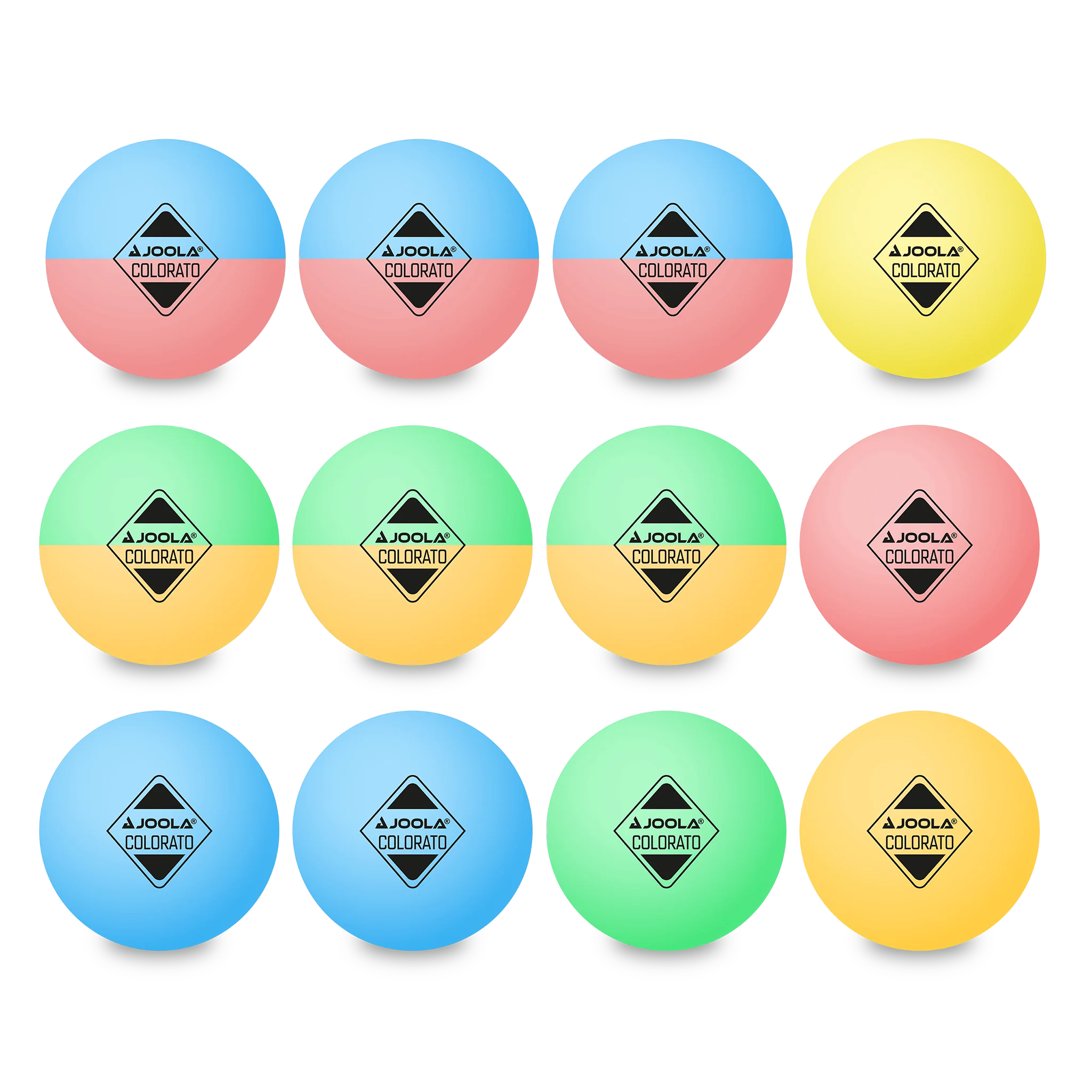 Tenis de masă într-un mod mai colorat! Set de 12 mingi cu 6 mingi de tenis de masa simple si 6 bicolore. Pe terenul de joaca al scolii sau cand te duelezi in gradina, vei fi intotdeauna cu un pas inainte cu mingile la moda JOOLA COLORATO.