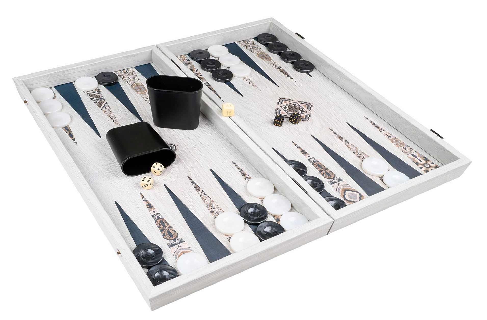 | Continut: | 1 cub dublu , 1 casetă , 2 cupe de zaruri , 4 zaruri , 15 piese de joc întunecate , 15 piese de joc ușoare , pungă de pânză pentru piese de joc |