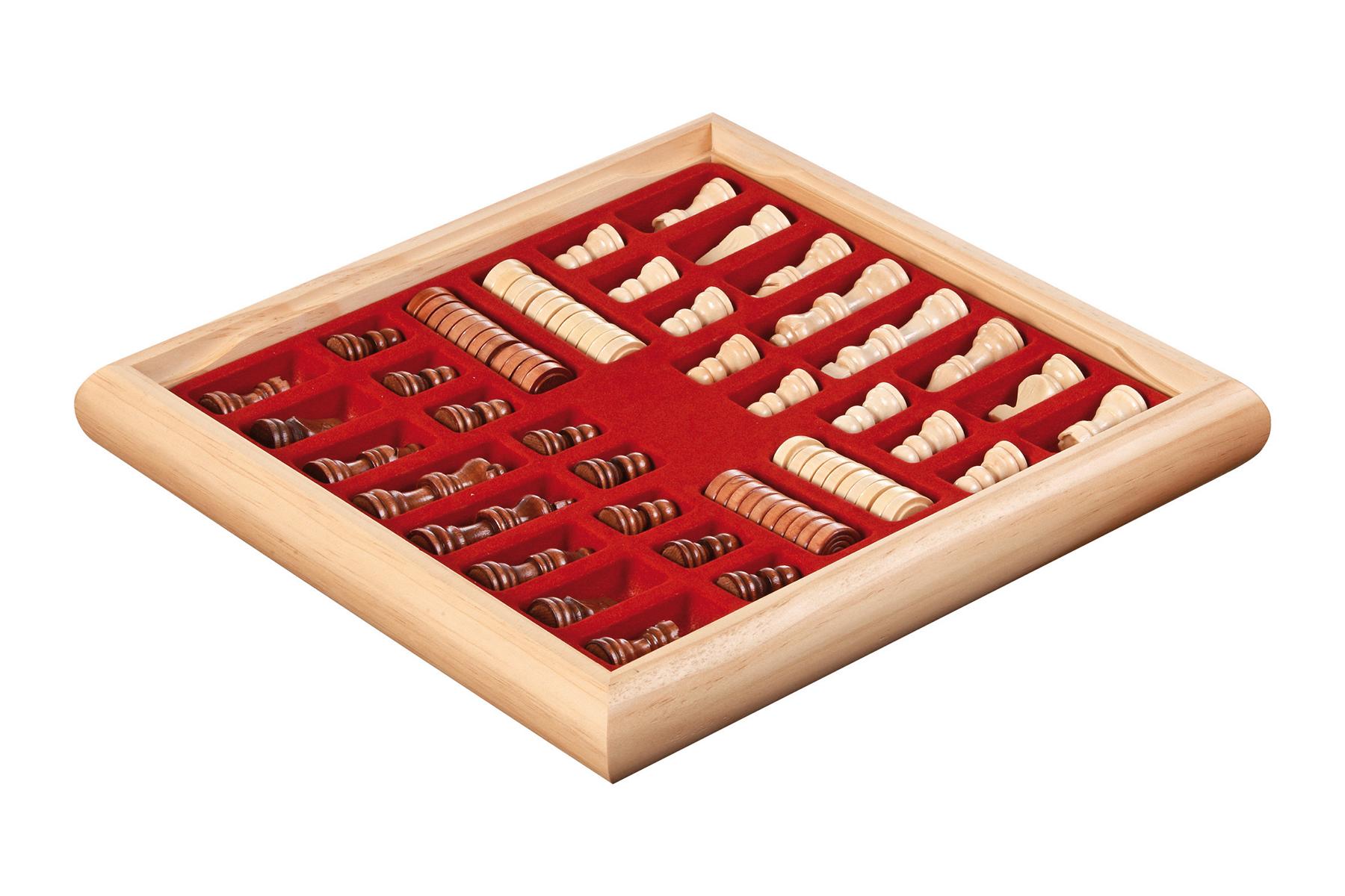 | Conţinut: | 1 casetă , 1 tablă de joc imprimată pe ambele părți , 16 piese de șah închise la culoare , 16 piese de șah deschise la culoare , 22 piese de joc închise la culoare , 22 piese de șah deschise la culoare |